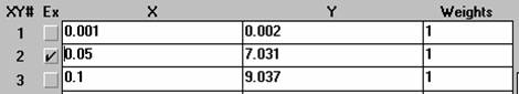 При необходимости из электронной таблицы можно временно исключить (сделать пассивной) любую строку набранных данных и тогда эти данные не будут влиять на результаты аппроксимации. Осуществляется это с помощью кнопок в столбце Ex. На рисунке показан случай, когда исключена вторая строка (вторая точка).