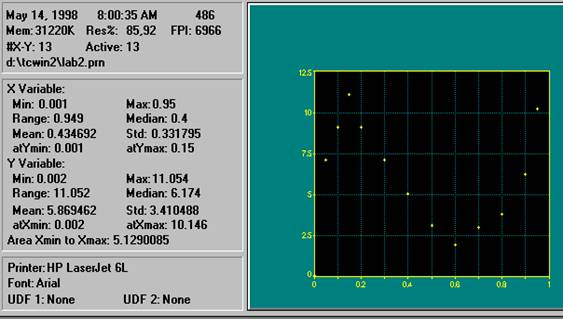 После завершения ввода опытных данных следует нажать кнопку Ок. В результате этого появится диалоговое окно, в котором спрашивается о необходимости сохранения набранных с клавиатуры данных. После выполнения стандартных действий на экране возникнет окно Table Curve, в котором представлен график исходных данных и некоторые описательные статистики.