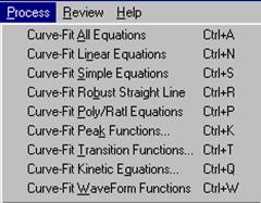 Для проведения регрессионного анализа в главном меню активизируется пункт Process. В том случае, когда известен вид функциональной связи между откликом и фактором, в ниспадающем меню можно выбрать соответствующие уравнения: простые (Simple Equations), полиномиальные и рациональные (Poly/Ratl) и др. В противном случае нужно выполнить команду All Equations, которая использует для аппроксимации все имеющиеся в системе математические модели.