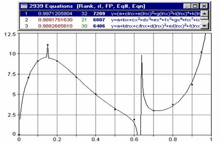 После проведения расчета можно получить изображение графиков всех моделей, а также численные значения коэффициентов уравнений регрессии. На рисунке показана “лучшая” модель, отобранная путем сортировки всех уравнений регрессии с помощью коэффициента детерминации.