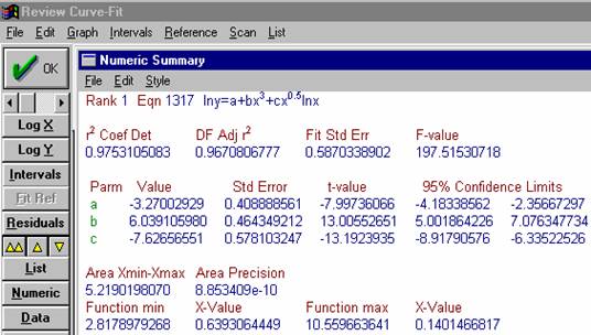 В появившемся окне Review Curve-Fit, фрагмент которого показан на рисунке, следует нажать кнопку Numeric. На экране появятся результаты расчета, среди которых указаны параметры модели, значения критериев сортировки и др.