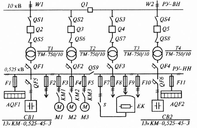 Энергия напряжением 525 В через автоматические выключатели QF 1 –QF 4передается на секции шин РУ НН, соединенных разъединителем QS 9. От РУ-ННэлектроэнергия распределяется по промышленным приемникам: через предохранители плавкие F 3 –F 5,магнитные пускатели КМ1 – КМЗэлектродвигательным устройствам М 1 –М З,через предохранители F 1и F 11шкафам из нескольких панелей AQF 1и AQF 2для электроосветительных установок и отдельных приемников малой мощности, через предохранитель F 7и рубильник S электронагревательной печи сопротивления ЕK,через предохранители F 2, F 8 –F 10остальным потребителям. Компенсатор реактивной мощности выполнен в виде двух силовых батарей СВ1и СВ2по 13 конденсаторов типа КМ-0,525-45-3, которые подключены к секциям РУ ННчерез автоматические выключатели QF 5и QF 6.