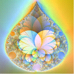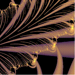 Фрактальные изображения с многоцветными завитушками относятся обычно к разряду так называемых фракталов с вpеменным поpогом, которые изображаются точками на комплексной плоскости с цветами, отражающими время, требуемое для того, чтобы орбита данной точки перешла ("перебежала") определенную границу.
