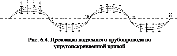 Надземный трубопровод на участках большой протяженности может быть уложен или в виде упругоискривленной кривой (рис. 6.4) или в виде зигзагообразной схемы (рис. 6.5).