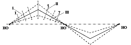 Компенсация удлинений осуществляется за счёт изменения положения в плане начального положения трубопровода I. Если участок удлиняется, то трубопровод займет положение II, если укоротится – положение III. При этом трубопровод будет перемещаться по подвижным опорам 1¸7 и поворачиваться на шарнирных опорах НО, которые не дают трубе передвигаться в продольном направлении.