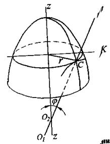 В оболочках вращения, образуемых вращением произвольной плоской кривой вокруг оси z-z (рис. 1.3), каждая точка меридиана описывает окружность, плоскость которой нормальна к оси z-z. Меридиан в каждой своей точке является одним из главных сечений поверхности. Радиус кривизны меридиана R 1, равный cO 1, является первым главным радиусом кривизны поверхности вращения. Параллель с радиусом r, являясь одной из линий кривизны поверхности, не является одним из главных сечений, таким сечением является кривая К, центр кривизны которой лежит на нормали в точке с поверхности и одновременно на оси y –y независимо от формы меридиана. Таким образом, второй главный радиус кривизны R2 равен сO2. Если j - угол между нормалью и осью вращения, а r – радиус параллели, то