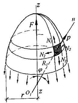 где N 1 и N 2 - соответственно меридиональное и кольцевое усилия; р - нормальная составляющая внешней нагрузки на элементарной площадке. Кроме того, рассматривая равновесие вершинной части оболочки, отсеченной горизонтальной плоскостью, перпендикулярной оси симметрии z-z, получают зависимость для определения меридионального усилия N 1
