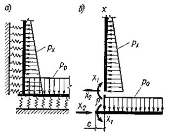 Предполагается, что полоски единичной ширины, вырезанные из стенки и днища, работают как балки на упругом основании (по гипотезе Винклера). Основную систему получили путем отрыва стенки от днища. Лишние неизвестные (Х 1 - изгибающий момент, Х2 - поперечная сила) определяются методом сил из решения канонических уравнений: