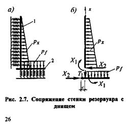 В зоне сопряжения стенки резервуара с днищем за счет стесненности радиальных деформаций стенки днищем возникают изгибающий момент и поперечная сила. Расчетная схема и основная система сопряжения показаны на рис. 22.7.