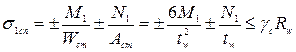 Проверку прочности углового шва, прикрепляющего стенку к днищу, производят на одновременное воздействие поперечной силы и момента. Меридиональное усилие ввиду малости не учитывают. Величину катета шва предварительно задают в пределах 0,3