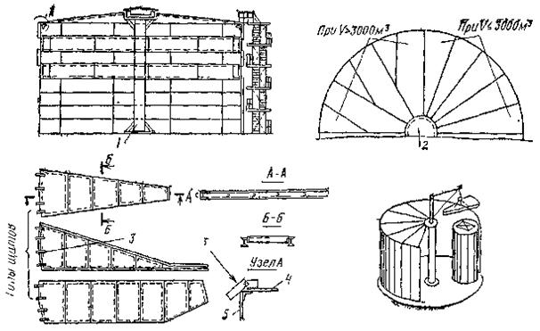 На рис. 22.8 показаны общий вид типового резервуара, изготовляемого методом рулонирования, со щитовой кровлей и схема его монтажа. Полотнище стенки такого резервуара навернуто на шахтную лестницу, а полотнище днища — на центральную стойку.