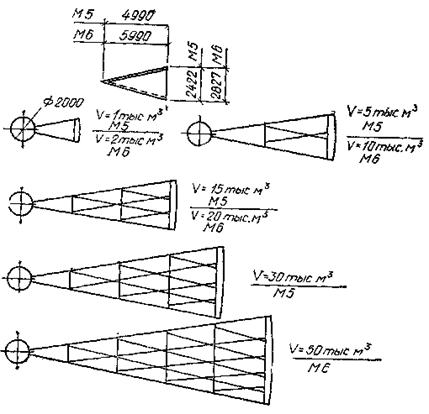 Рис. 22.11. Схемы унифицированных щитов сферических покрытий для резервуаров объемом от 1 до 50 тыс. м3