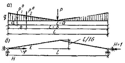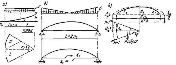 Эффективными крышами являются сферические щитовые покрытия с радиальными ребрами жесткости и кольцом жесткости, расположенным по наружному контуру сферы. При расчете на равномерно распределенную вертикальную нагрузку покрытие расчленяют на отдельные плоские арки, состоящие из двух диаметрально расположенных криволинейных щитов. Каждую такую арку рассчитывают как плоскую двухшарнирную арку с условной затяжкой. Расчетные схемы двухшарнирной арки представлены на рис. 22.13, б, в.