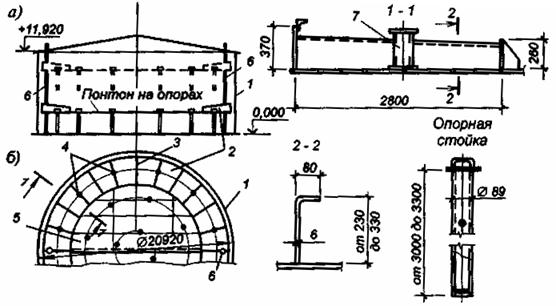 Опорные стойки делают плавающими трубчатого сечения. Обычно нижнее положение понтона предусматривают на отметке 1,8 м, поэтому стойки имеют различную длину, связанную с их расстоянием от центра мембраны и принятого уклона мембраны и днища резервуара.