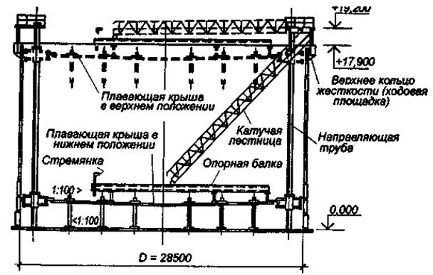 Понтонное кольцо в нижнем положении опирается на стойки, расположенные в один ряд по окружности, а центральная часть понтона опирается на стойки, расположенные по концентрическим окружностям, число которых зависит от объема резервуара. Чтобы предотвратить поворот понтона при его подъеме и опускании под воздействием жидкости, на днище размещают две направляющие трубы, которые наверху свободно устанавливают в патрубки, прикрепленные к покрытию резервуара, а внизу приваривают к днищу.
