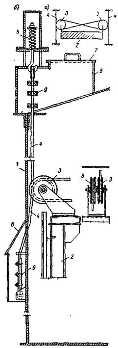 а) принципиальная схема выравнивающего устройства; б) узел выравнивающего устройства; 1 - корпус; 2 - шайба; 3 - ролики; 4 - канат; 5 – верхний узел натяжного устройства; 6 – коробка натяжного устройства; 7 – крышка коробки; 8 – козырек узла закрепления каната; 9 – сжимы для канатов