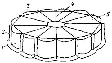 1 - стенка; 2 - контрфорс; 3 – обвязочные балки; 4 – плавающая крыша; 5 – щиты покрытия