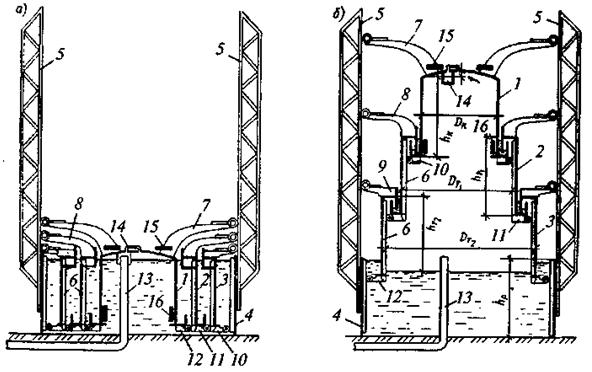 а) подвижные звенья опущены; б) подвижные звенья подняты давлением газа; 1 - колокол; 2 - 1-й телескоп; 3 - 2-й телескоп; 4 - резервуар; 5 - внешние направляющие; 6 - внутренние направляющие; 7 - верхний ролик колокола; 8, 9 - верхние ролики телескопа; 10 - нижний ролик колокола; 11, 12 - нижние ролики телескопа; 13 - газоввод; 14 – колпак над газовводом с перепускной трубой; 15 – верхние бетонные грузы; 16 – нижние чугунные грузы