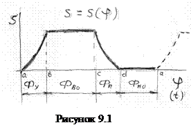 Графическая или аналитическая зависимость перемещения толкателя от угла поворота кулачка S=S(φ) называется законом движения толкателя. Пример закона движения толкателя показан на рисунке 9.1.