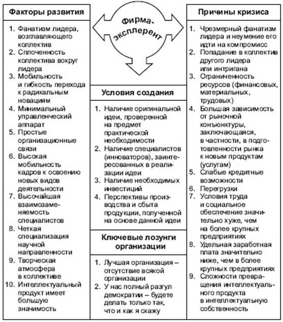 Такие организации (фирмы), называемые эксплерентными – уже некие организации, но еще не фирмы в полном смысле этого слова.Коллектив эксплерентной организации – это весьма инициативные люди. Лидером является человек, способный увлечь идеей, пользующийся авторитетом, имеющий сильный и волевой характер. Это антрепренер, т. е. человек, способный в силу своей предприимчивости начинать новое дело, ощутить его экономическую перспективность. Начинать дело трудно и опасно – здесь необходимы решительность и воля, доверие и уважение, активность и настойчивость.