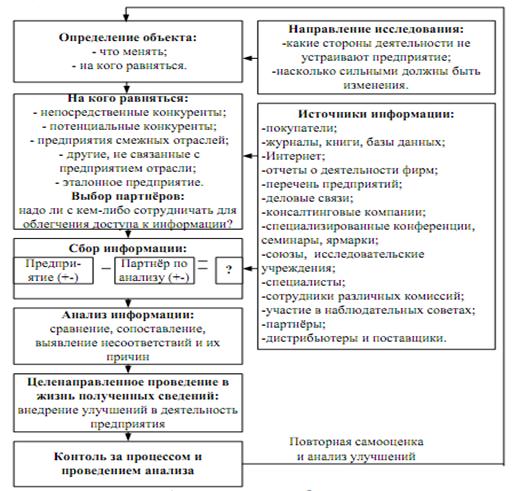 Бенчмаркинг - это одно из направлений маркетинговых исследований. Для фирмы, столкнувшейся с определёнными трудностями в формировании стратегии, определении более конкурентоспособных характеристик товара да и вообще с любыми трудностями производственного характера, он становится незаменимым инструментом.В общем виде методика проведения бенчмаркинга представлена на рис. 7.1.