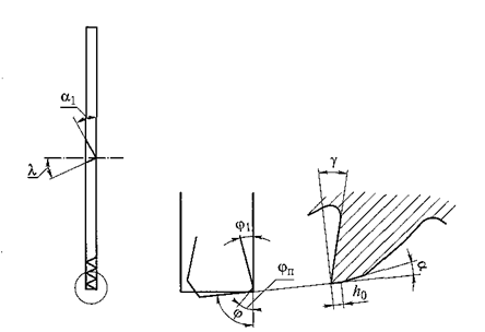 Глубина резания определяется углом в плане и длиной режущей кромки, участвующей в резании. Для создания небольших положительных вспомогательных углов в плане путем поворота режущей пластины главный угол в плане φ может быть назначен чуть меньше 90° (например, 85...87°).