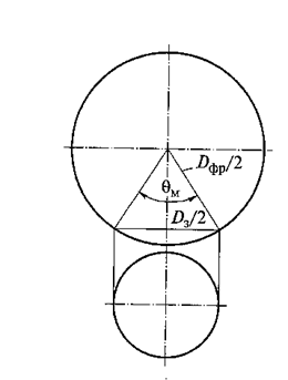 Число зубьев, одновременно участвующих в работе, зависит от угла контакта пилы с заготовкой и от угла между зубьями. Угол контакта пилы с заготовкой зависит от соотношения диаметров заготовки D3 и пилы Dфр (рис. 3.29): ΘМ = 2aicsin D3 / Dфр = 49,2°
