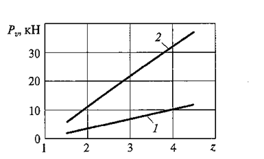 Рис. 3.30. Зависимость силы подачи Рv от числа зубьев z, одновременно находящихся в контакте с разрезаемой заготовкой, для острозаточенной (hз = 0,1мм) и затупившейся (hз = 1мм) дисковых пил: 1- hз = 0.1мм; 2 - hз = 1мм.