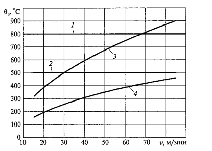 Рис. 3.31. Влияние скорости резания на максимальную температуру задней поверхности режущего лезвия дисковой фрезы (диаметр 600мм, число зубьев z = 32) при разрезании прутка из стали 45 диаметром d = 250мм: 1- рациональная температура для твердого сплава; 2 - рациональная температура для быстрорежущей стали;