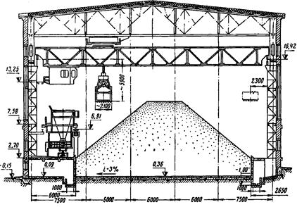 Дренажные склады строят закрытого или открытого типа с наклонным бетонным полом и дренажными канавами для стока воды, проходящими по всей длине склада. Полы склада имеют уклон в направлении дренажных канав. В некоторых случаях на пол укладывают дренирующий слой из крупного булыжника на подстилке из песка. Материал для обезвоживания подают на склад (рис. 2.1) ленточными конвейерами. Укладка материала в штабель может производиться грейферным краном, экскаватором или ленточным конвейером. Разгрузка штабеля по окончании времени обезвоживания производится грейферным краном в загрузочную емкость, под которой находится конвейер для транспортирования обезвоженного продукта.