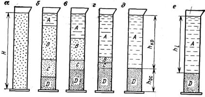 Исследования проводят в лабораторных цилиндрах вместимостью 0,5 или 1 л. Пробу помещают в цилиндр, многократно перемешивают, а по окончании перемешивания отсчитывают время осаждения. На цилиндры вертикально наклеивают полоску миллиметровой бумаги со шкалой, ноль шкалы должен совпадать с уровнем суспензии. В первом цилиндре (рис. 3.2, а) показана исходная пульпа. Через некоторое время в цилиндре (рис. 3.2, б) образуются следующие зоны: А – зона осветленной жидкости; В – зона свободного осаждения или зона суспензии исходной плотности; C –зона стесненного осаждения; D – зона уплотнения осадка.