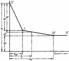 На кривой сгущения можно выделить три характерных участка: KL – соответствует свободному осаждению частиц с максимальной скоростью (скорость определяется тангенсом угла наклона прямой); LM – соответствует периоду уплотнения осадка; MN – слабо наклоненная, практически горизонтальная прямая, характеризует конечное сжатие осадка, когда за продолжительный промежуток времени очень незначительно изменяется высота осветленного слоя.