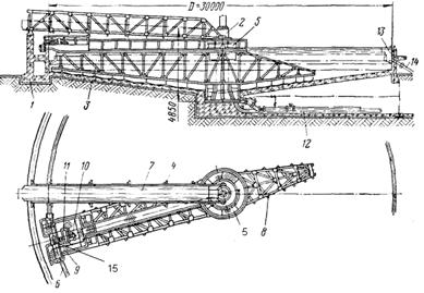 Сгуститель с центральным приводом тяжелого типа (рис. 3.8) состоит из железобетонного чана 1, в центре которого установлена мощная железобетонная колонна 4. На колонне укреплена опорная головка 5 с приводным механизмом 6. Приводной механизм состоит из электродвигателя 10, связанного клиноременной передачей 11 с червячным редуктором 17, передающим вращение на ведущую шестерню 15. Шестерня находится в зацеплении с зубчатым венцом внутреннего зацепления (диаметром около 3 м), жестко связанным с поворотным опорным кольцом 12. Кольцо 12 опирается на подшипник, представляющий собой сплошное кольцо 14 с проточкой, в которую уложены стальные шарики 13.