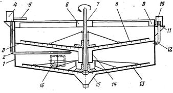 Наиболее широко применяются двухъярусные сгустители (особенно сбалансированные – уравновешенные), как наиболее удобные по распределению нагрузки между отдельными ярусами. Двухъярусный сгуститель (рис. 3.10) состоит из чана 1, разделенного промежуточным днищем 3 на верхний и нижний ярусы. Гребковые рамы верхнего 8 и нижнего 13 ярусов укреплены на одном вертикальном валу 7. Механизмы привода вертикального вала и подъема гребковых рам аналогичны механизмам привода одноярусного сгустителя легкого типа.