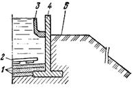 Рис. 3.11. Схема сгустителя с грунтовым днищем: 1 – слои грунта; 2 – гребковый механизм; 3 – сливной желоб; 4 – железобетонная стенка; 5 – насыпь |