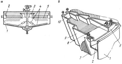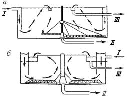 В США фирма "Инвайро Клер" разработала новые конструкции сгустителей с верхним и нижним питанием (рис. 3.18). При подаче питания через верхний горизонтальный питатель (рис. 3.18, а) в сгустителе образуются зона осветленного слива и зона уплотнения, что позволяет поддерживать высокие скорости осветления жидкости без выноса твердых частиц в слив. Четыре скребка на дне сгустителя продвигают осевший материал к разгрузочному отверстию. Скорость осаждения твердых частиц в 6–10 раз выше по сравнению с обычными радиальными сгустителями; при этом достигается почти десятикратная экономия площади.