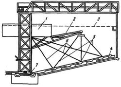 4 – гребковая рама; 5 – поворотные тросы; 6 – подвесные тросы; 7 – шарнир