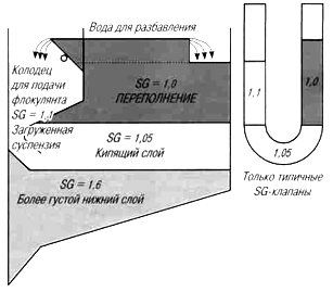 Из ожиженной зоны флокулы осаждаются в зону сгущения (ниже отражательного конуса), а слив удаляется через кольцевой сливной желоб. В сгустителе наблюдаются три четкие зоны: