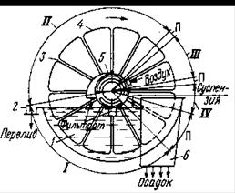 Процесс фильтрования осуществляется по следующей схеме. В зоне I после погружения барабана в пульпу секции барабана посредством распределительной головки соединяются с вакуум-системой, поэтому на поверхности фильтроткани откладывается слой осадка и происходит отсасывание жидкости. Вода проходит через поры фильтроткани и попадает в секции барабана, откуда по трубкам отводится в каналы полой цапфы, и далее через камеры распределительной головки по выводным трубам в ресивер.