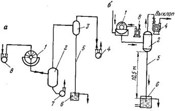 В схеме с принудительным отводом фильтрата из ресивера насосами (рис. 4.18, а) смесь фильтрата с воздухом через распределительную головку также поступает в ресивер, в котором происходит предварительное разделение жидкой и газообразной фаз. Фильтрат скапливается в нижней части ресивера и непрерывно откачивается центробежным насосом. Воздух с остатками фильтрата в виде капель поступает в гидроловушку, где происходит окончательное отделение фильтрата, что исключает его попадание в вакуум-насос. Фильтрат из гидроловушки стекает по барометрической трубе в гидрозатвор, который устанавливается ниже её на 10,5 м. Нижний конец барометрической трубы опущен в воду для предупреждения засасывания атмосферного воздуха в трубу.