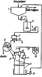 Рис. 4.21. Схема фильтровального отделения: 1 – сгуститель; 2 и 4 – насосы; 3 – усреднитель; 5 – пульподелитель; 6 – вакуум-фильтр; 7 – задвижка; 8 – ресивер зоны набора осадка; 9 – ресивер зоны сушки; 10 – вакуум-насосы; 11 – барометрические трубы; 12 – пароконденсатор; 13 – вакуум-провод; 14 – задвижка; 15 – насос