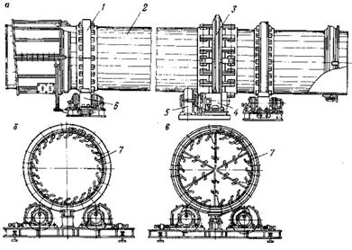 Рис. 5.4. Сушильный барабан: а – общий вид; б – лопастная насадка; в – секторная насадка; 1 – бандажи; 2 – барабан; 3 – зубчатый венец; 4 – редуктор; 5 – электродвигатель; 6 – опорные ролики; 7 – насадки |