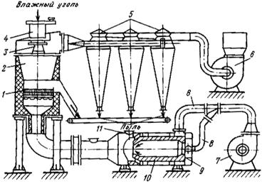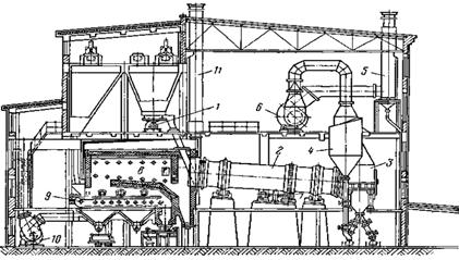 Рис. 5.9. Схема компоновки сушилки кипящего слоя: 1 – распределительная решетка; 2 – сушильная камера; 3 – забрасыватель; 4 –редуктор забрасывателя; 5 – циклоны; 6 – дымосос; 7 – дутьевой вентилятор; 8 – воздухопроводы; 9 – горелка; 10 – топка; 11 – ленточный конвейер |
