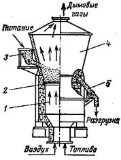 Сушка в кипящем слое применяется для углей крупностью до 50 мм и мелкозернистых рудных материалов равномерной крупности. Сушилка кипящего слоя (рис. 5.8) представляет собой шахту, разделенную по высоте газораспределительной решеткой 2 на две камеры: верхнюю – сушильную 4 и нижнюю – топливно-смесительную 1. В нижнюю камеру под давлением поступают газы из топки и распределяются по всему сечению сушильной камеры. Верхняя камера является зоной кипящего слоя. Сушимый материал подается сверху из бункера питателем 3. Высушенный материал разгружается через патрубок 5 над решеткой, высоту расположения которого над решеткой можно регулировать. Отработанные газы вместе с испаренной влагой направляются в пылеуловители.