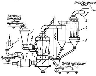 Горячие газы засасываются из топки при помощи вентилятора-дымососа через нижний конец трубы-сушилки. Частицы материала при своем движении в потоке горячего газа (воздуха) высушиваются, улавливаются в циклоне или сепараторе и разгружаются через разгрузочные устройства на конвейер. Отработанные газы после дополнительной очистки в батарейном пылеуловителе или мокром пылеуловителе, а иногда и в электрофильтре, выбрасываются в атмосферу. Пыль, уловленная в батарейном пылеуловителе, также разгружается на ленточный конвейер с высушенным материалом.