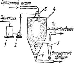 Рис. 5.11. Схема распылительной сушилки: 1 – расходный бак; 2 – насос; 3 – распылительное устройство; 4 – камера; 5 – циклон; 6 – затвор |