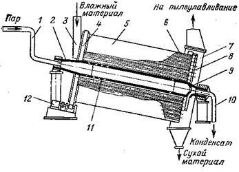 В торцевых днищах укреплены обогреваемые паром сушильные трубки 6, в которые при помощи специального питательного приспособления 3 вводится сушимый материал, перемещающийся при вращении барабана по наклону к его разгрузочной стороне. Параллельно с сушимым материалом по сушильным трубкам движется нагреваемый трубками воздух, который воспринимает испаряемую из угля влагу и выходит из сушилки через трубку для паровоздушной смеси. Пар для обогрева трубок поступает по паропроводу 1, вводится через переднюю цапфу в центральную трубу 11 и через имеющиеся в ней отверстия попадает в полость барабана между трубками.