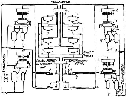 Централизованные фильтровальные отделения действуют на крупных отечественных железорудных комбинатах: ЦГОК, СевГОК, НКГОК, ЛебГОК. Схема цепи аппаратов централизованного фильтровального отделения на обогатительной фабрике № 2 СевГОКа показана на рис. 6.6. Оно рассчитано на ежегодный выпуск 8,5 млн т концентрата [6].