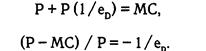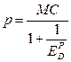 Данная формула представляет собой правило «большого пальца» для ценообразования. Левая часть уравнения (Р - МС)/Р выражает превышение цены над предельными издержками как процент от цены. Уравнение показывает, что, данное превышение равняется величине, обратной эластичности спроса, взятой с отрицательным знаком. Можно переписать это уравнение, чтобы выразить цену через предельные издержки: