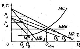 Общий объем выпуска Q определяется пересечением МС и МRΣ Проходящая через точку пересечения Е горизонтальная линия EMR — линия равного предельного дохода. Точки пересечения этой линии с линиями предельного дохода МRА и МRВ позволяют определить объемы продаж и цен для каждого рынка. На рынке А будет реализовано QА единиц товара по цене РА, на рынке В — QВ единиц товара по цене PВ. При таком решении окажется, что МRА = МRВ = МRΣ = МС.
